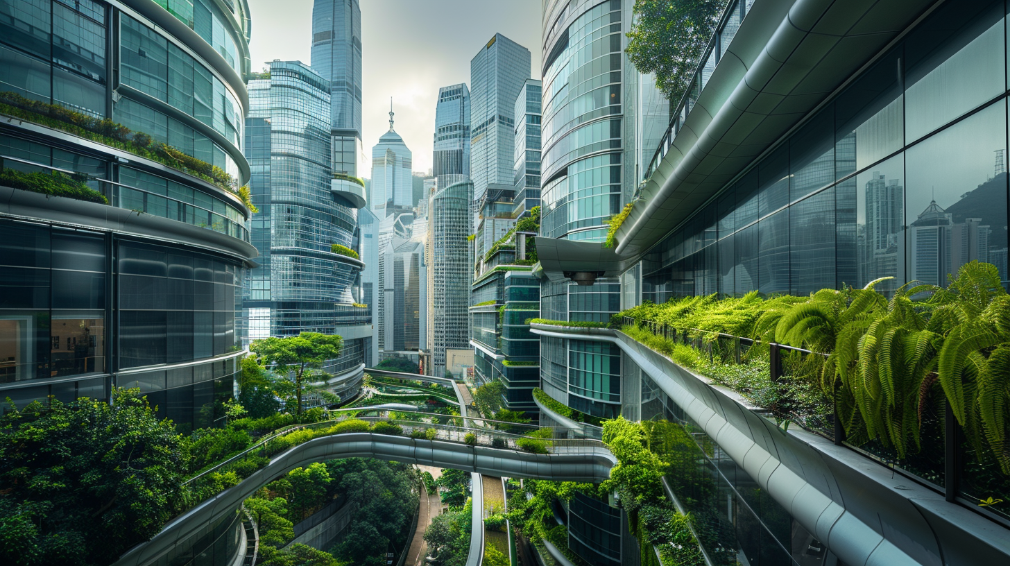 futuristic view of Hong Kong in 2125, sidewalk perspective, dense vertical development integrating residential, commercial and recreational spaces within interconnected skyscrapers adorned with rooftop gardens. Verdant parks and green zones bridge various urban sectors, skywalks connecting towers at multiple levels.. Traditional cultural landmarks blend with avant-garde architecture. Captured with a Hasselblad H6D-100c for hyper-realistic detail --ar 16:9
