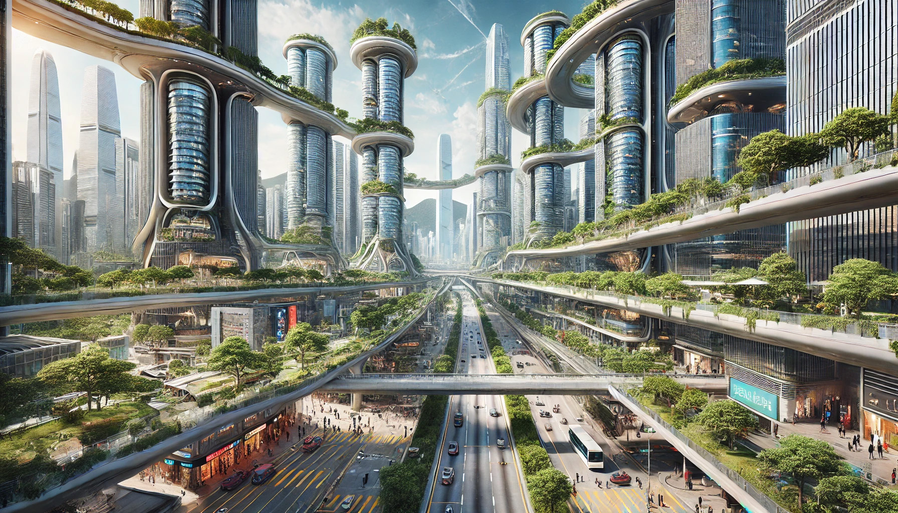 futuristic aerial view of Hong Kong in 2125, iconic harbor and skyline. dense vertical development integrating residential, commercial, and recreational spaces within sleek, interconnected skyscrapers adorned with rooftop gardens. Verdant parks and green zones bridge various urban sectors, with bustling skywalks connecting towers at multiple levels. Advanced smart grids power the city with renewable energy, while autonomous vehicles glide through layered underground networks. Traditional cultural landmarks blend seamlessly with avant-garde architecture. Captured with a Hasselblad H6D-100c for hyper-realistic detail --ar 16:9 --v 5.2 --s 1000