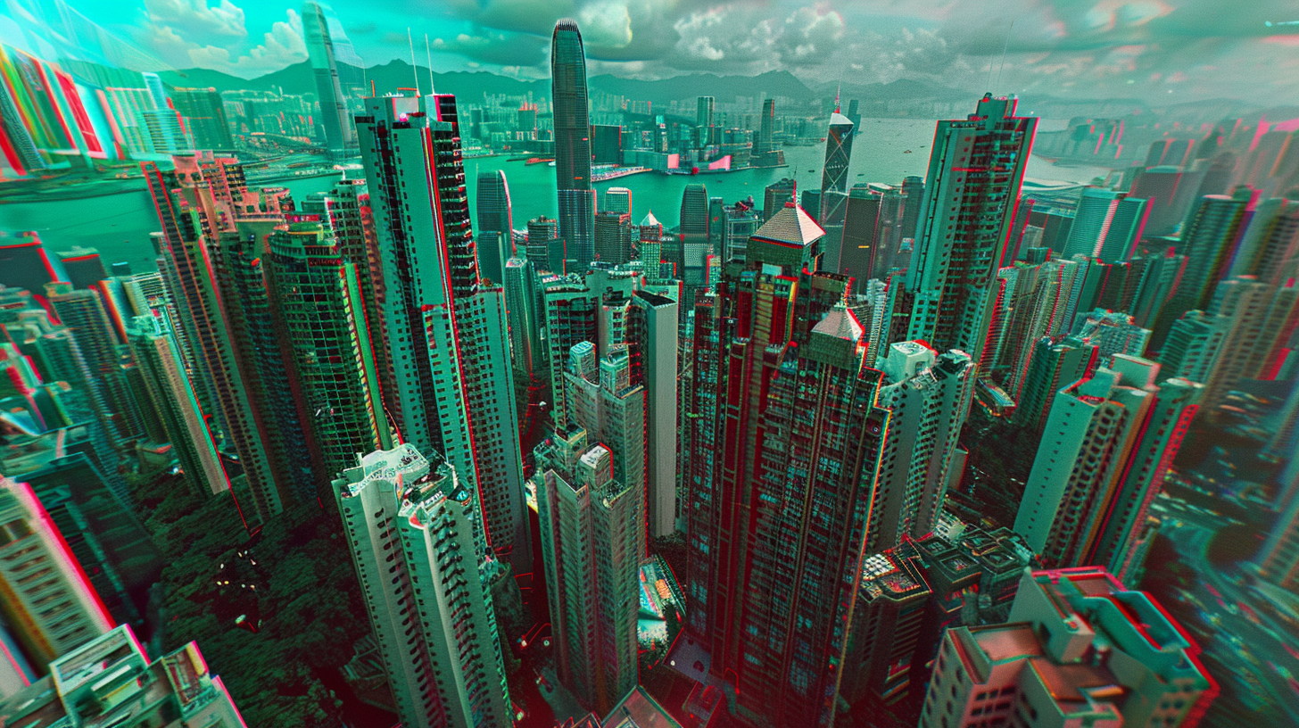 anaglyph, futuristic view of Hong Kong in 2125, dense vertical development integrating residential, commercial and recreational spaces within interconnected skyscrapers adorned with rooftop gardens. Verdant parks and green zones bridge various urban sectors, skywalks connecting towers at multiple levels.. Traditional cultural landmarks blend with avant-garde architecture. Captured with a Hasselblad H6D-100c for hyper-realistic detail --ar 16:9