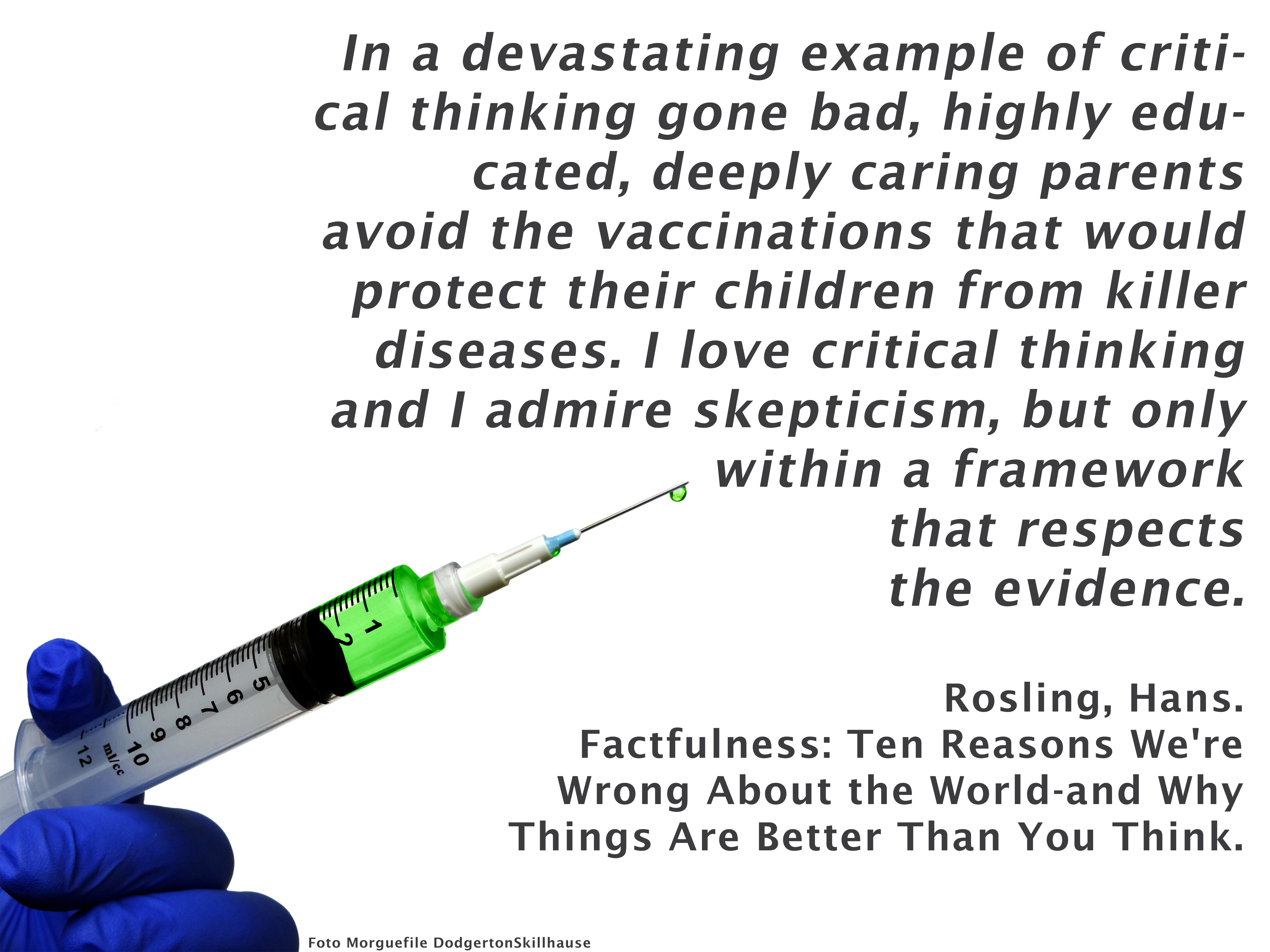 In a devastating example of critical thinking gone bad, highly educated, deeply caring parents avoid the vaccinations that would protect their children from killer diseases. I love critical thinking and I admire skepticism, but only within a framework that respects the evidence.