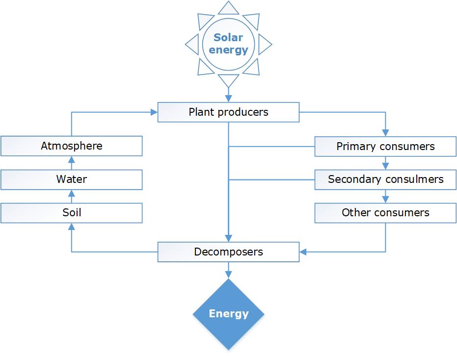 L'énergie solaire est à la base de la composante biotique. Celle-ci, dans son ensemble, se comporte comme un organisme où toutes les formes de vie sont liées entre elles. Si même un seul élément venait à manquer, la physionomie de la communauté changerait en conséquence, adoptant une nouvelle organisation (biocénose).