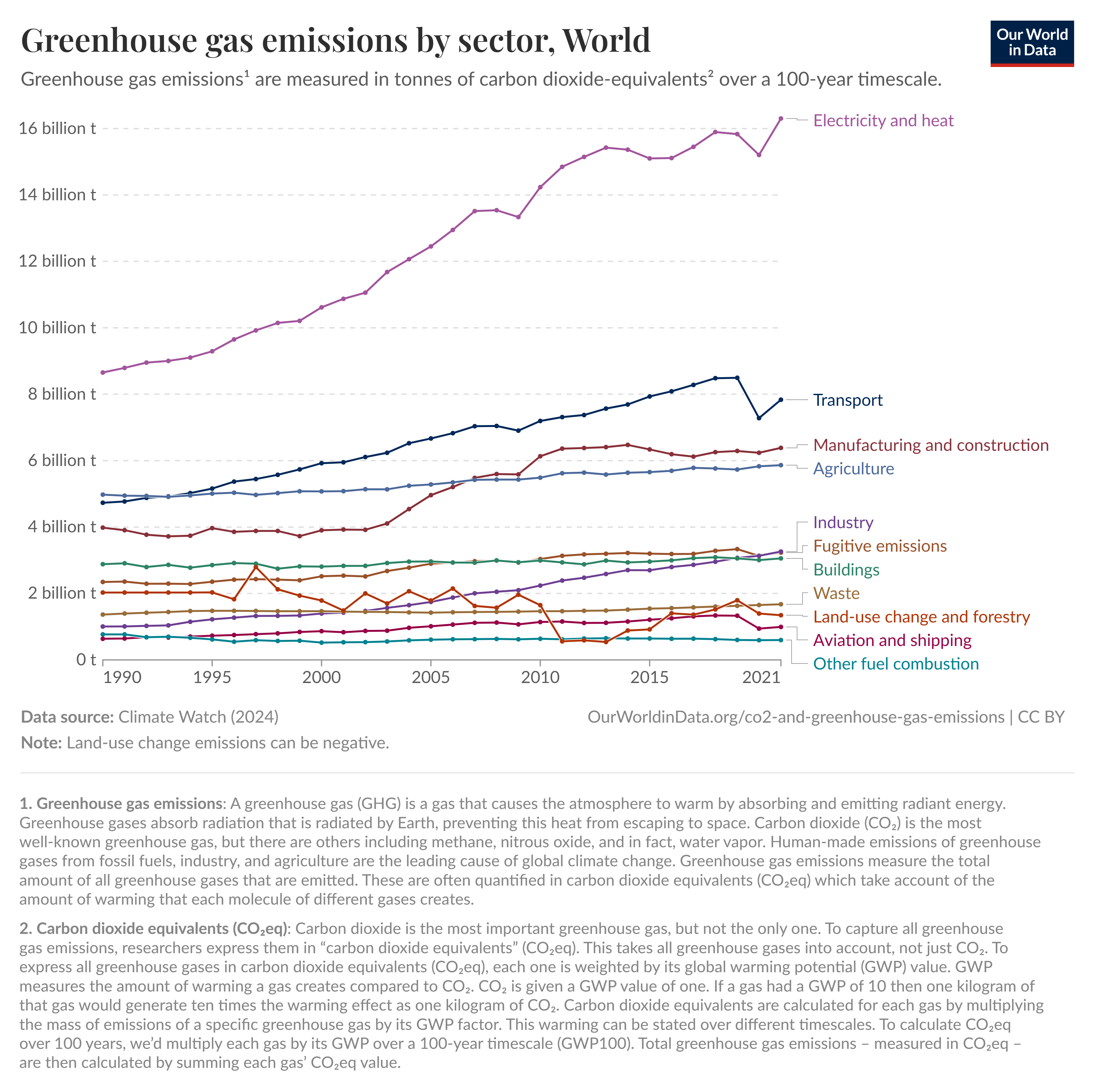 Proposez une liste des activités humaines qui - selon vos connaissances actuelles - ont un impact majeur sur les écosystèmes. Classez-les de la plus importante à la moins importante. À la fin, commentez le résultat obtenu avec les données suivantes, qui présentent les émissions totales de gaz à effet de serre, par secteurs.