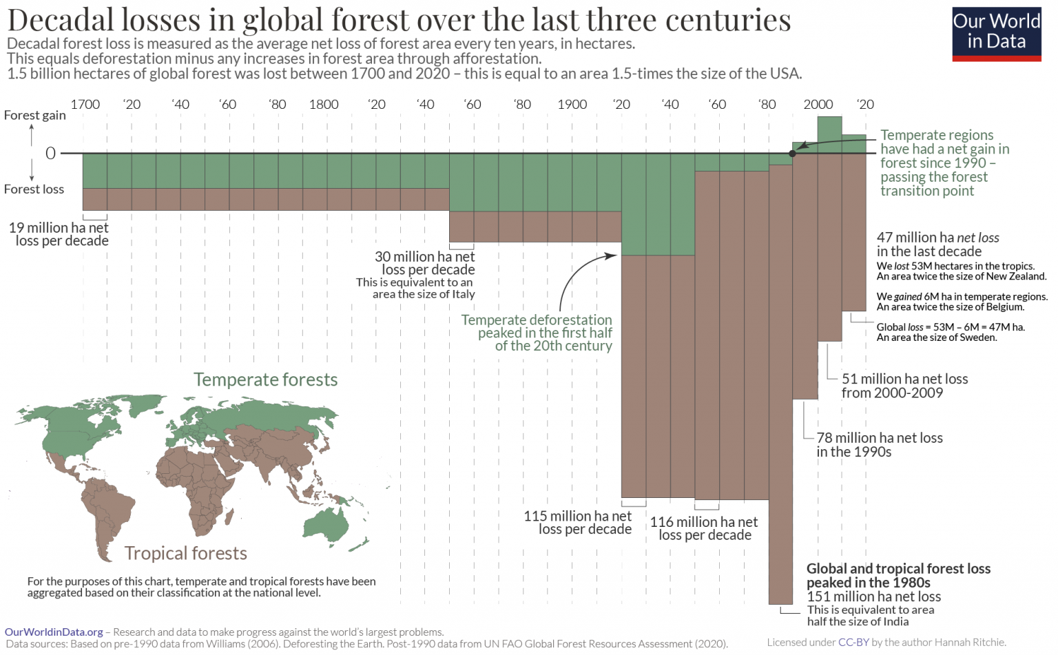 Depuis lors, de nombreux facteurs ont contribué à un renversement de tendance assez marqué, passant à 78 millions d'hectares dans les années 90, 52 au cours de la première décennie de 2000 et 47 entre 2010 et 2020. Les forêts tempérées enregistrent depuis quelques décennies un taux positif de reforestation qui s'établit à 6 millions d'hectares au cours de la dernière décennie : cette tendance, appelée point de transition forestière, permet d'être optimiste quant à l'avenir des forêts tropicales humides.